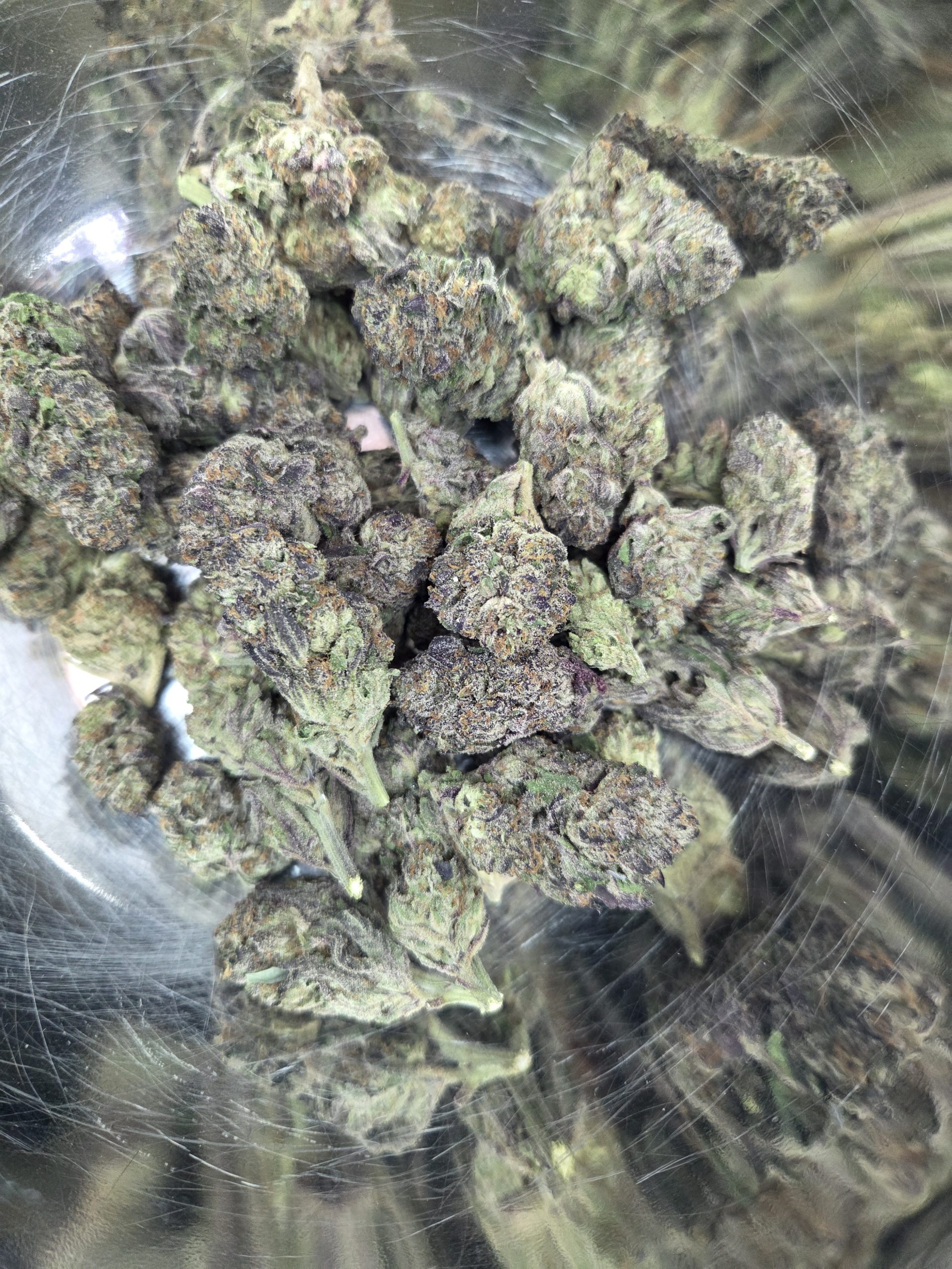 Appearance: Long, thin buds. Dark greens and orange with lots of purple. Clear sticky trichomes.