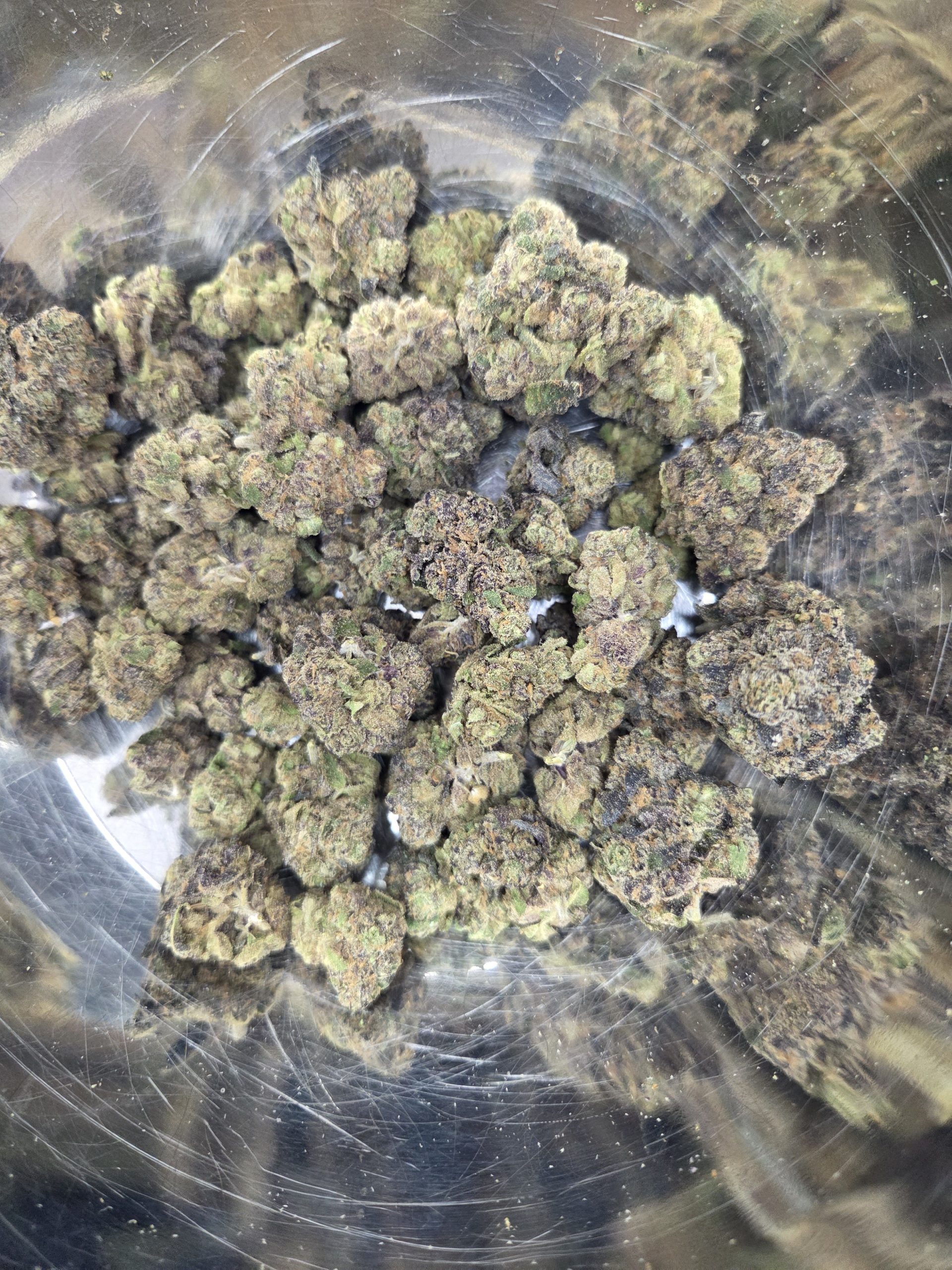 Appearance: Mid-sized, round, gnarly buds with all dark hues of green, purple, orange. Soft and sticky with gooey trichomes.