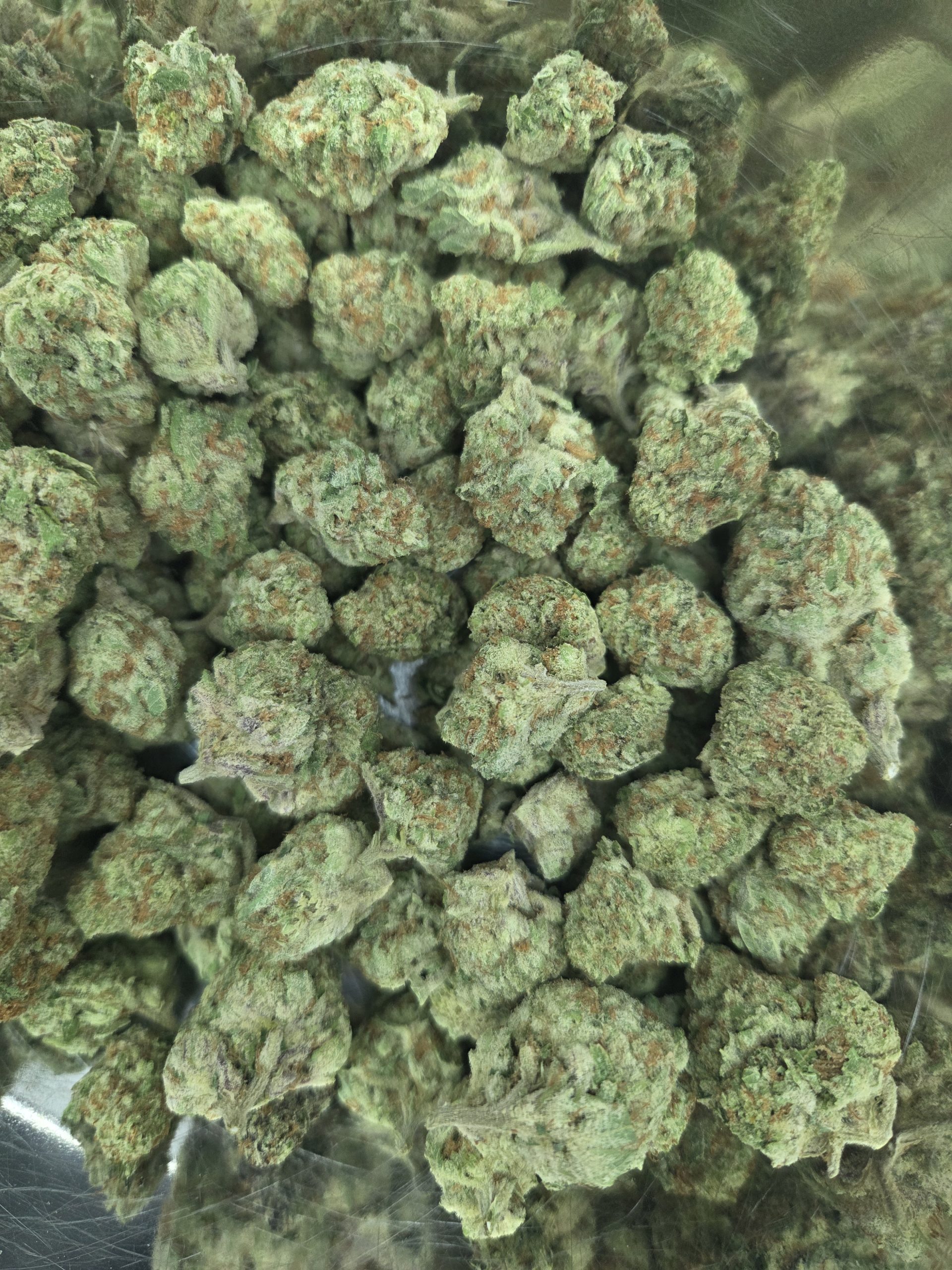 Appearance: Round, medium sized buds that are very light green with light orange pistils. Very occasional lavender spots. White trichomes